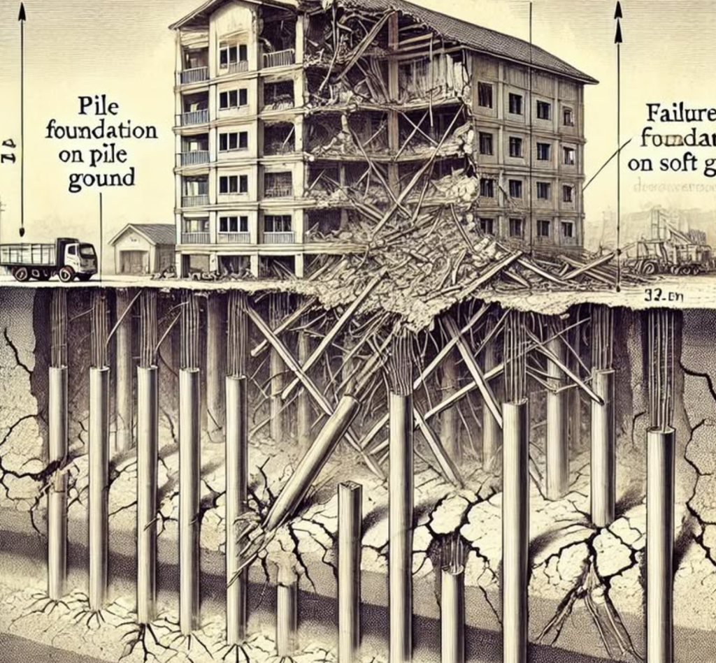 Soft ground characteristics may prevent piles from providing adequate support. Earthquakes can cause piles to be pushed deeper into the ground, leading to significant interactions with the soil. This may result in pulling or bending of the piles, compromising foundation stability.